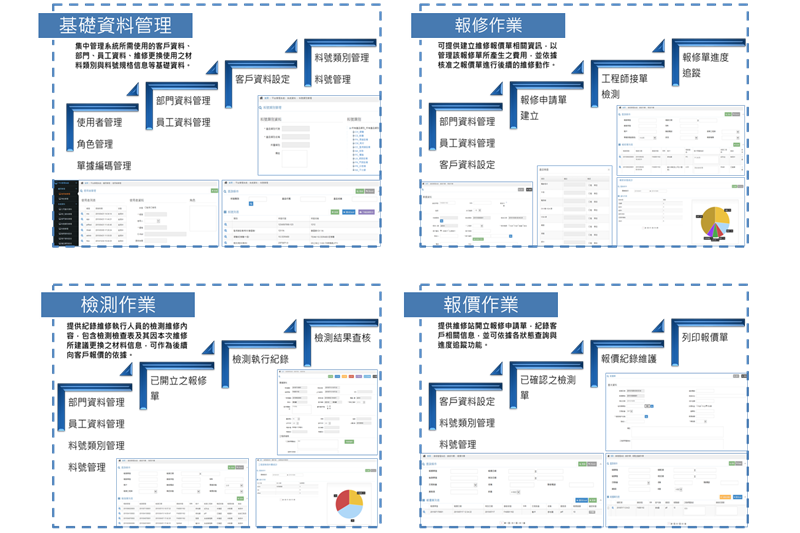 維修管理系統(Maintenance Management System) MMS系統主要提供管理者對公司維修部門內各項報修維修過程進行管理:包含報修維修作業管理、更換料件紀錄、維修報價紀錄,以及工程師每日派工項目等所需之相關報表及紀錄作業;可獨立使用並可作為與企業ERP或生產系統平台串聯的重要子模組,進而實現部門效率最大化、人員稼動最佳化的管理目標。