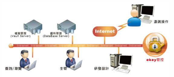 ezPDM支援多點應用,透過Internet或企業內部Intranet網路,可執行產品圖檔及文件資源的有效應用,後端並以SQL資料庫管理所有文件資料及屬性等資料、同時圖檔集中管理,對於不同版次及最終版次鎖定等,也提供方便管理;同時,系統內建E-Key管理機制,有效管理帳戶及記錄操作歷史,做到最佳的安全控管。